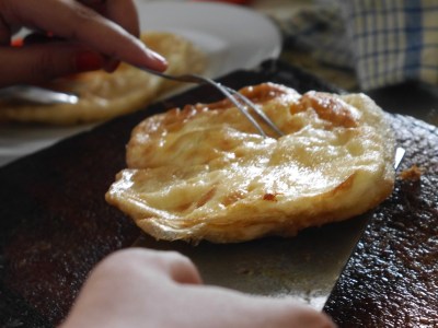 | Martabak yang sudah digoreng sedang ditiriskan. |