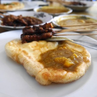 | Martabak HAR disajikan dengan kari kambing dan sate ayam. |